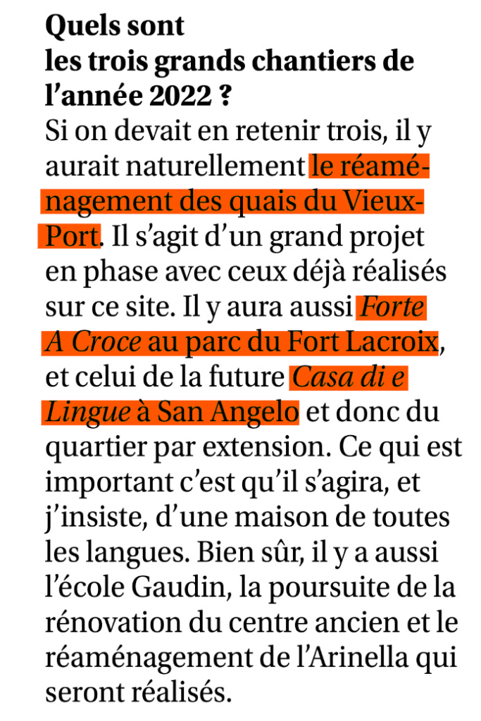 Le Maire de Bastia a accordé une interview à Corse Matin (04/01/22). A cette occasion, il lui est demandé les 3 grands chantiers de Bastia pour 2022.