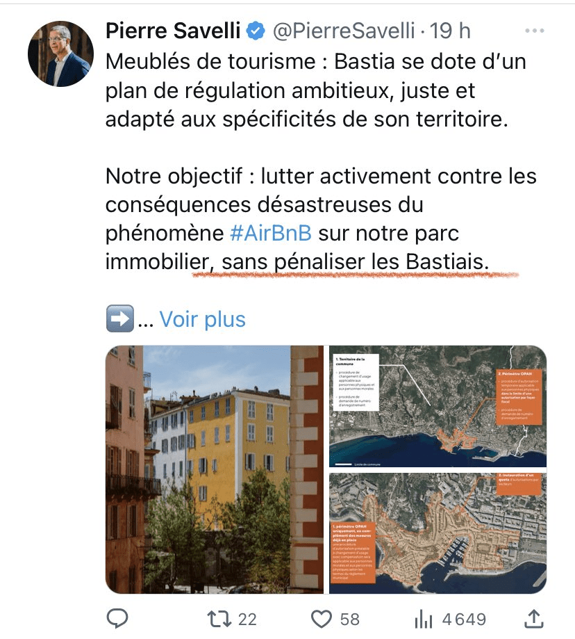 On saisit mieux le sens du tweet de Pierre Savelli (2 juin 2023) dans lequel il expliquait que son objectif était de lutter contre les conséquences désastreuses du phénomène AirBnB « sans pénaliser les Bastiais ».