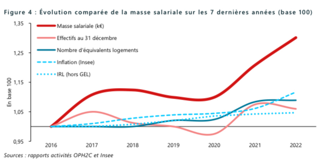 Dans le même temps, la masse salariale explose. (+30 % depuis 2016) sans explication rationnelle ou mécanique. La taille de l’effectif global est particulièrement élevée pour un organisme de moins de 3 500 logements