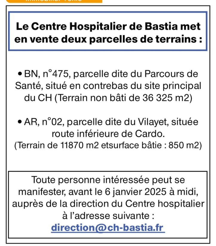 Dans un souci de recherche de financement, le directeur de l’hôpital a décidé de vendre 2 terrains appartenant au centre hospitalier : Le Vilayet (à Cardo) et le parcours de santé (à proximité de l’hôpital). Une annonce a été publiée dans ce sens dans Corse Matin et les personnes intéressées doivent se faire connaitre avant le 6 janvier 2025 midi !