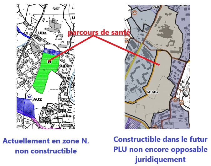Le parcours de santé soulève également un problème majeur : il est actuellement classé en zone N (non constructible). Sa reclassification en zone constructible est envisagée dans le cadre du nouveau PLU, mais celui-ci n’est pas encore juridiquement opposable.