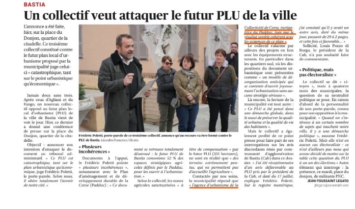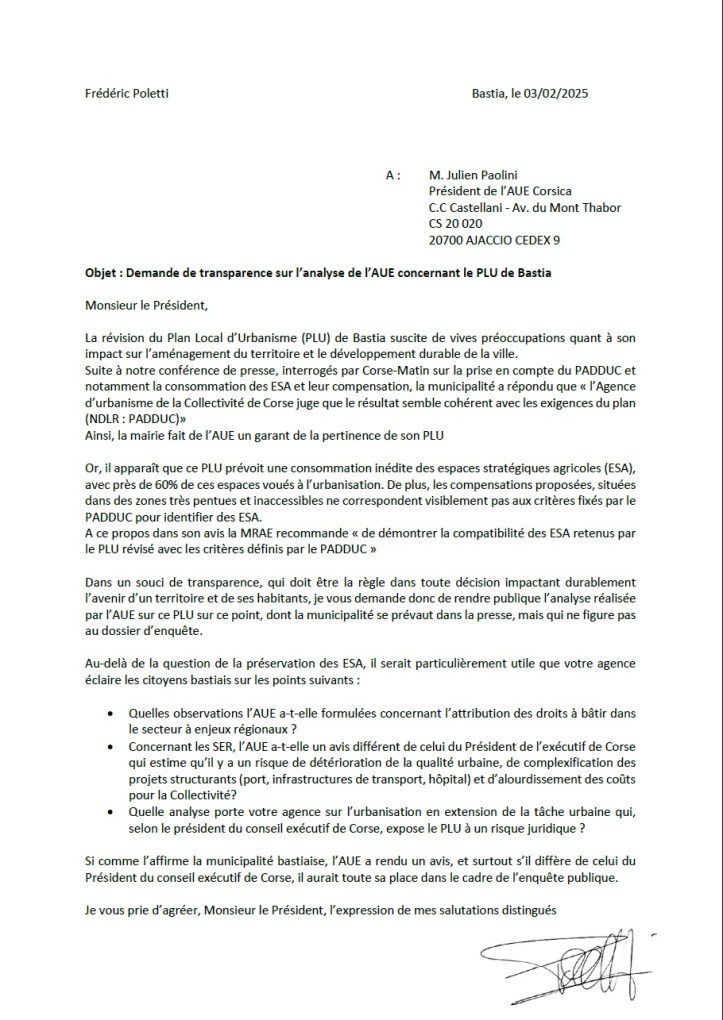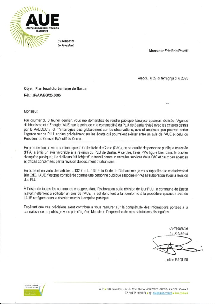 Comme la mairie de Bastia s’est prévalue dans Corse Matin d’un avis favorable de l’agence de l’urbanisme de Corse (AUE), j’avais interpellé son président pour clarifier la position de l’agence.