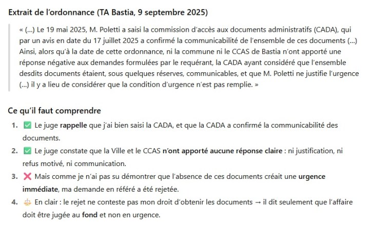 Dans ce combat que je mène contre la mairie de Bastia au nom de l’intérêt général, je n’ai pas su convaincre le juge des référés de l’urgence qu’il y avait à obtenir certains documents de la Ville et du CCAS de Bastia pour le contentieux budgétaire que j’ai porté devant le Tribunal administratif.