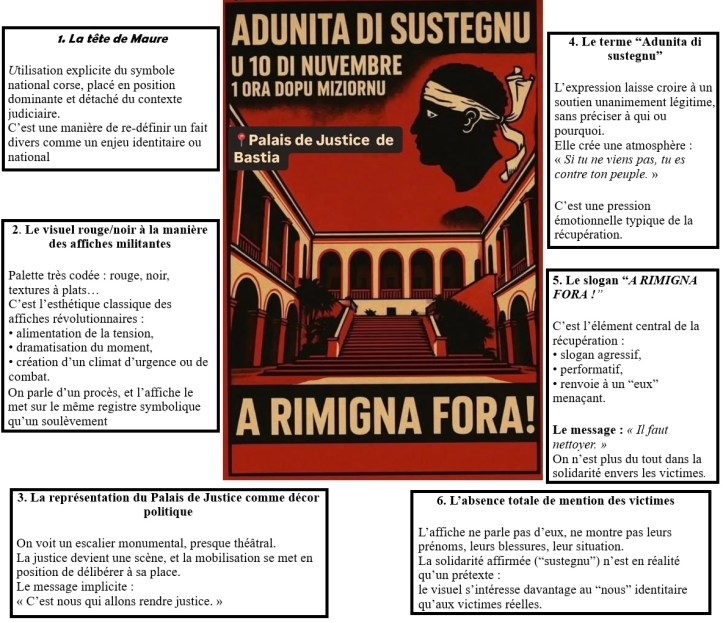 On a vu fleurir un visuel. Cette affiche récupère l’agression de Corte pour la reconditionner en cause identitaire. La tête de Maure, les couleurs rouge et noir, le Palais de justice transformé en scène et le slogan “A rimigna fora” fabriquent un récit collectif qui dépasse totalement les faits.